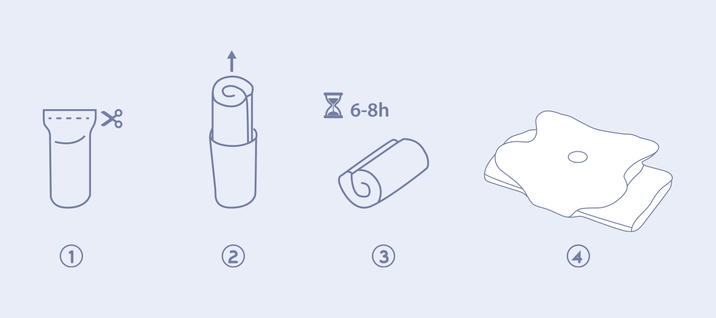 - 收到枕头后,请将其从包装中取出并平铺放置于通风干燥处(避免阳光直射),静置6-8小时,枕芯即可完成回弹至设计形态。